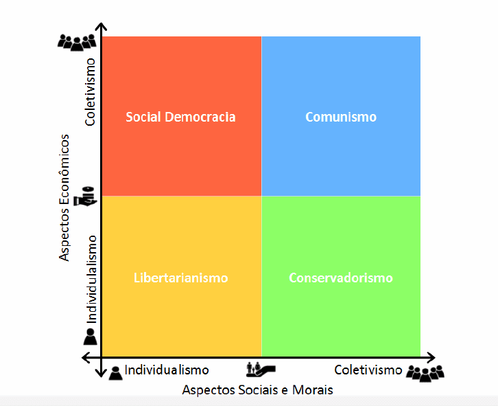 É importante entender que esta tabela não apresenta todos os pensamentos políticos existentes, mas apenas um exemplo de pensamento político para cada combinação possível de ideias individualistas e coletivistas.