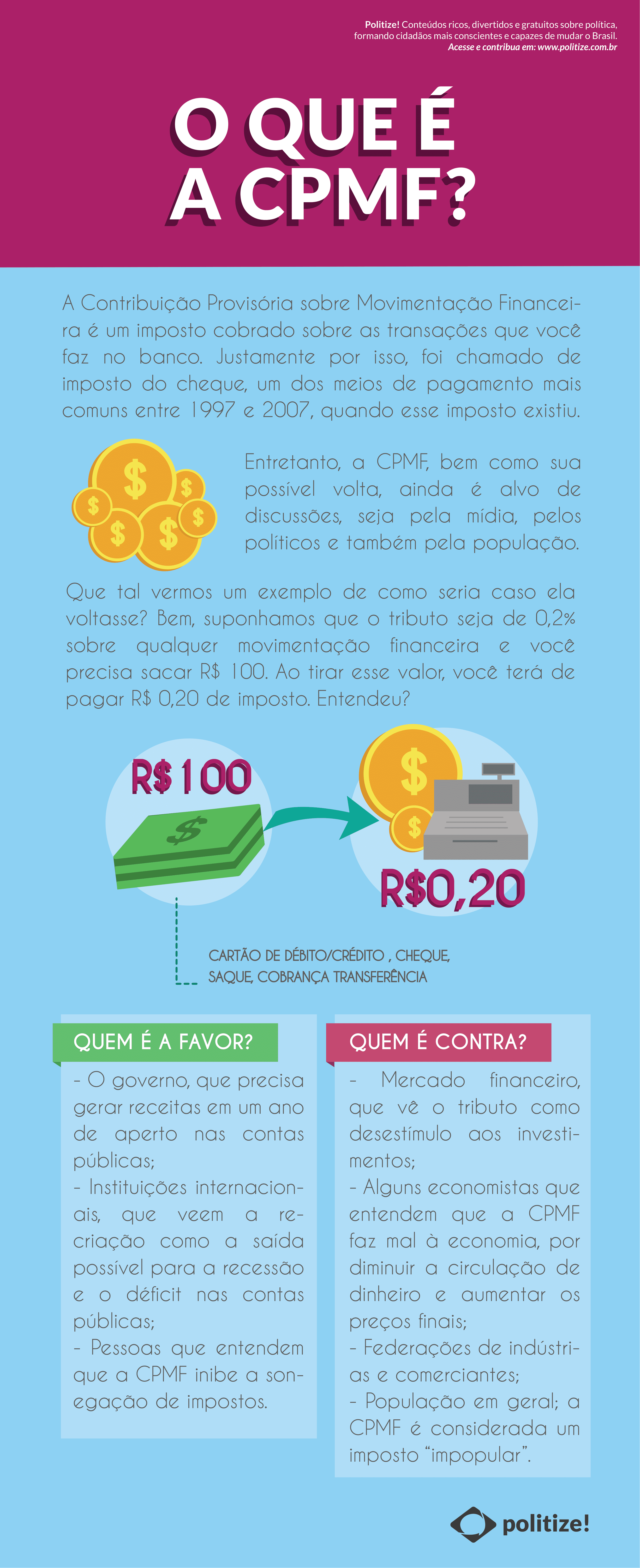 A Contribuição Provisória sobre Movimentação Financeira foi criada em 1997, no governo FHC. No entanto, este foi um imposto extinto em 2007, no governo Lula. Essa contribuição incidia sobre toda e qualquer transação que alguém fizesse no banco. Ou seja: qualquer saque, transferência ou mesmo cheque que você assinasse tinha uma pequena porcentagem arrecadada pelo governo. Na época de sua extinção, a CPMF cobrava 0,38% do total movimentado.