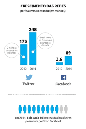 A revista Tema se propôs a discutir a questão “redes sociais e eleições” e o impacto desse fenômeno no comportamento da população cibernética durante o processo eleitoral de 2014. Nesse estudo foram catalogados dados que demonstram o crescimento da utilização das redes sociais e o consumo de conteúdo sobre eleições por esses meios. Vejamos:
