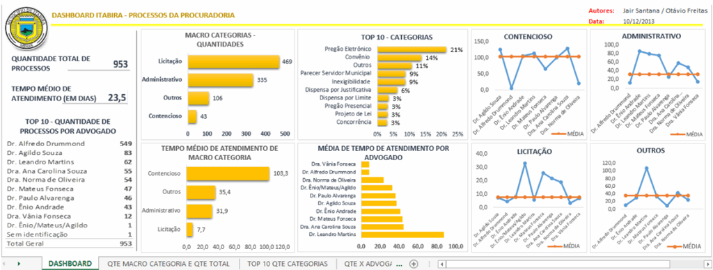 Assim, pelo dashboard acima passamos a mensurar os indicadores dos processos internos da PGM por prazos, inclusive medindo e comparando performances pessoais de cada procurador, quais eram as secretarias mais requisitantes de análises jurídicas; enfim, podíamos colocar qualquer filtro para fazer análises quantitativas e qualitativas da equipe. E tudo podia ser visto ao vivo por qualquer um que fosse à PGM (open data).