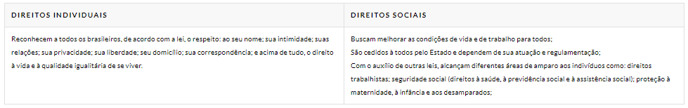 Os direitos sociais buscam a qualidade de vida dos indivíduos assim como os direitos individuais. No entanto, apesar de estarem interligados, é necessário diferenciá-los para uma melhor compreensão: