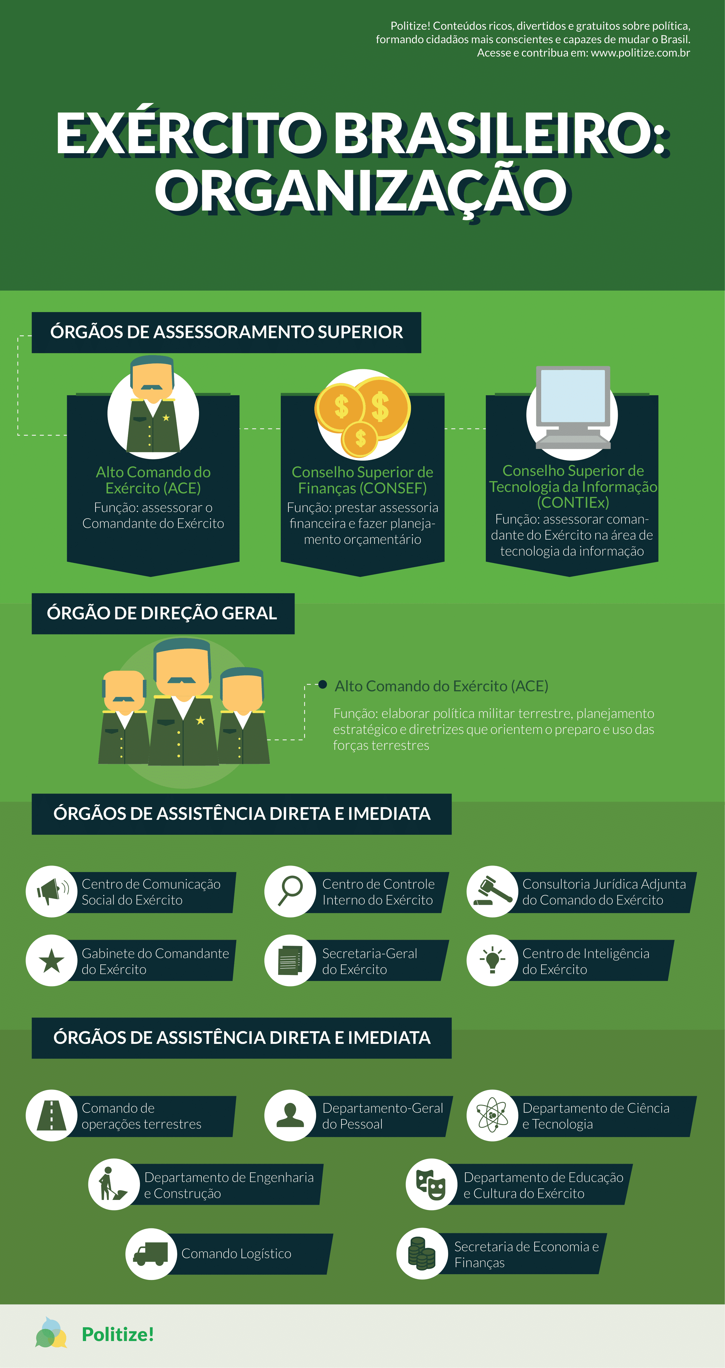 Por fim, sob autoridade do Estado Maior do Exército estão os órgãos de direção setorial, responsáveis pelos recursos humanos, logística, educação e engenharia. Dentre esses órgãos está o Comando de Operações Terrestres (COTER), que é especialmente importante para o funcionamento da instituição. O COTER é o órgão que dirige o emprego dos meios e recursos humanos do exército brasileiro, por meio dos oito Comandos Militares. Esses comandos militares são grandes comandos operacionais que dirigem as Divisões de Exército e as brigadas, que serão explicadas no próximo texto da trilha.