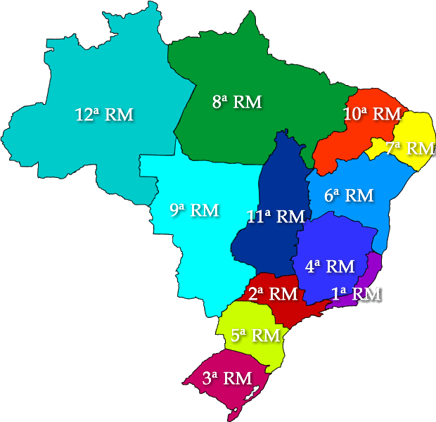 O Brasil também é dividido em grandes comandos logísticos e administrativos — as Regiões Militares (RM), que ficam sob autoridade dos comandos militares. Na figura 3 estão ilustradas as 12 regiões militares brasileiras. Essas regiões agrupam estruturas administrativas e logísticas para atender os seus respectivos territórios.