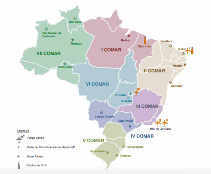 Desde o fim de 2016, um grande processo de reestruturação está em curso na FAB. As quatro Forças Aéreas continuam como divisões macro dos meios operacionais da força. Do ponto de vista territorial, até 2016 o Brasil era dividido em sete Comandos Aéreos Regionais (COMARs), cada qual englobando uma certa porção do território nacional. A figura 2 mostra como era essa antiga divisão.