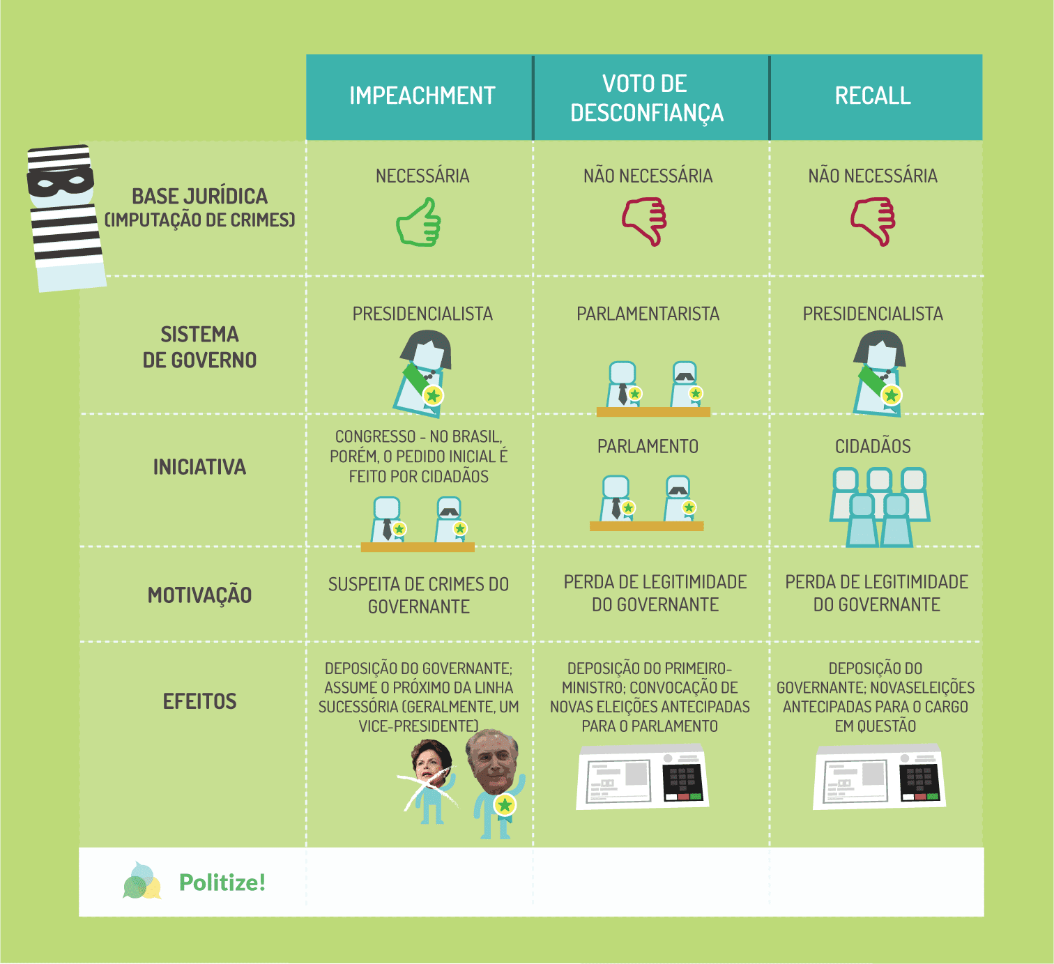 Por fim, é importante diferenciar o recall e o impeachment, que têm em comum o fato de serem usados no presidencialismo. O impeachment, como vimos, tem uma importante base jurídica, ao passo que o recall não depende de qualquer tipo de imputação dessa natureza. Basta apenas que a população demonstre a opção pela destituição e troca do governante impopular. Ou seja, o governante só precisa ser ruim ou impopular, não precisa ter cometido crimes no seu cargo.
