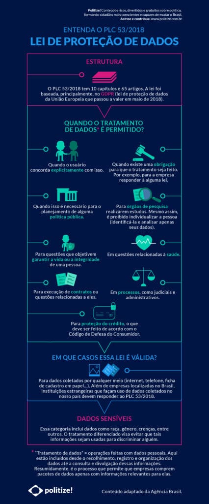 Em julho de 2018, o Senado aprovou o Projeto de Lei da Câmara (PLC) nº 53/2018, que define questões sobre a proteção de dados pessoais. Tal lei foi sancionada pelo presidente Temer e muda a forma que dados podem ser coletados e tratados e vale para empresas e Poder Público. Quer entender um pouco mais sobre essa legislação e qual a necessidade de definir regras específicas para a proteção de dados? O Politize! te explica.