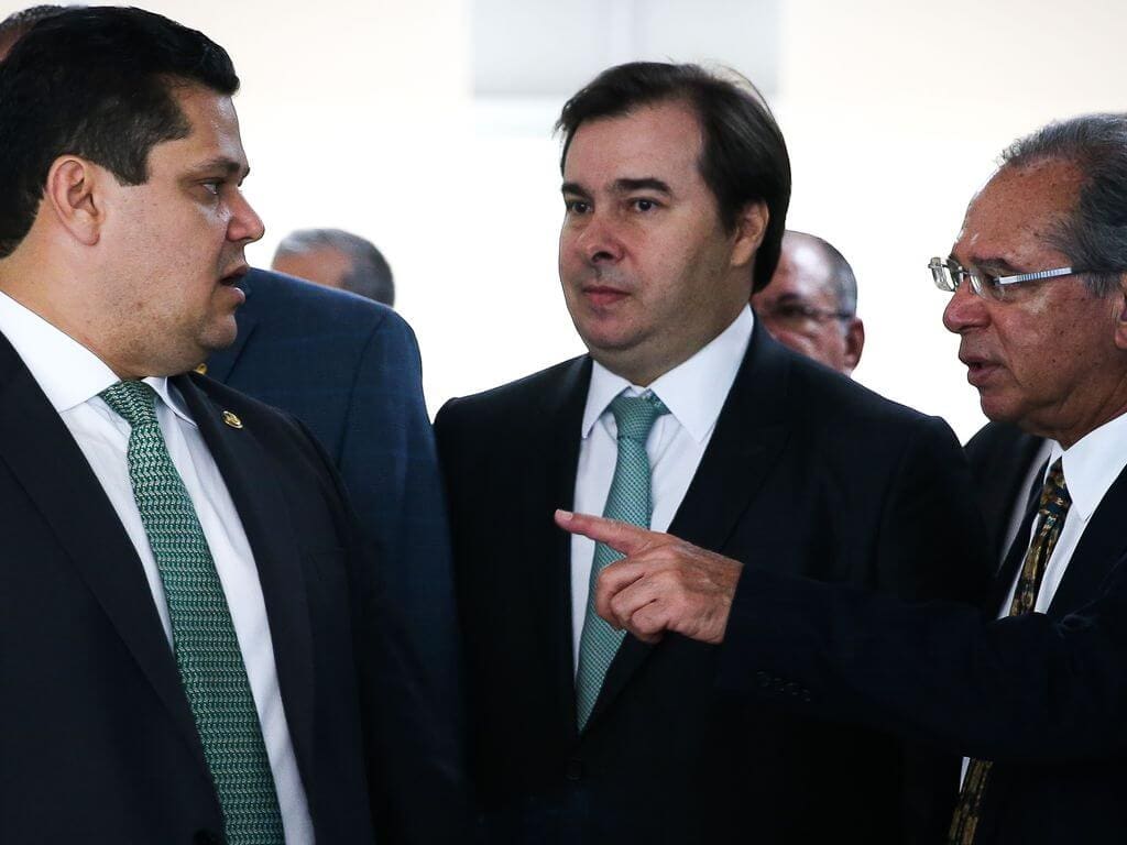 Davi Alcolumbre (presidente do Senado); Rodrigo Maia (presidente da Câmara) e Paulo Guedes (Ministro da Economia). Foto: Agência Brasil