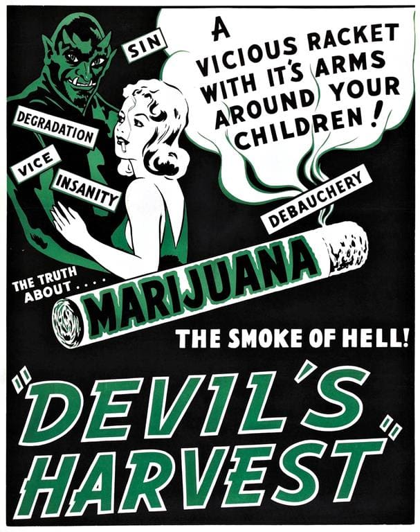 Os cartazes faziam associações da maconha com orgias estranhas e festas selvagens e traziam mensagens como “o cigarro do inferno”, “um vício que abraça suas crianças” junto a palavras como degradação, pecado, insanidade, crime, tristeza, ódio e vergonha.
