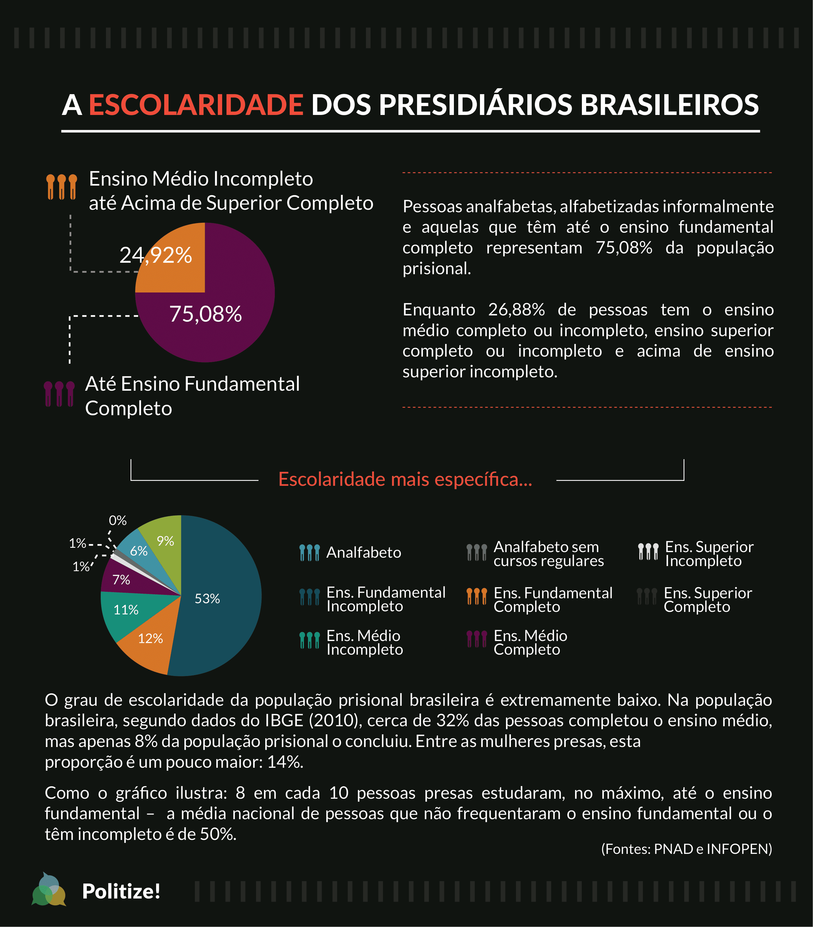 Intuitivamente, por conta de estereótipos e senso comum, é dedutível que a população prisional no Brasil tenha menor grau de escolaridade – e os números confirmam essa impressão. Segundo o relatório do Ministério da Justiça, “manter os jovens na escola pelo menos até o término do fundamental pode ser uma das políticas de prevenção mais eficientes para a redução da criminalidade e, por conseguinte, da população prisional”.