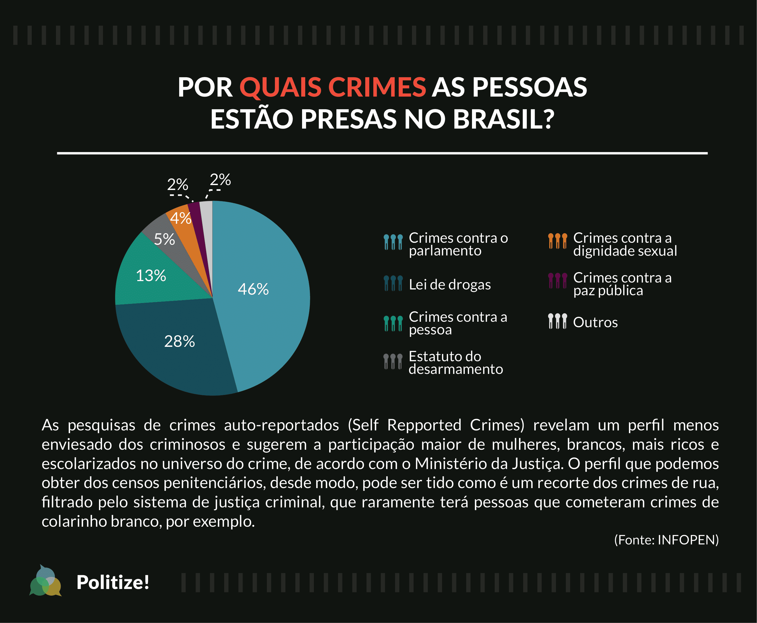 De acordo com o relatório do Departamento Penitenciário Nacional, do Ministério da Justiça, as pessoas que estão hoje encarceradas no Brasil, em geral, apresentam um perfil: eles cometeram crimes mais visíveis e/ou mais violentos e passaram pelos filtros do sistema de justiça criminal. Ao colocar isso em seu relatório, o Ministério da Justiça visa a por que de as pessoas que hoje estão presas, estarem lá, e principalmente quem são essas pessoas.
