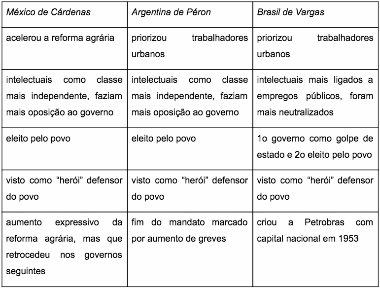 Mesmo com esses pontos econômicos em comum, os governos populistas do Brasil, México e Argentina tiveram diferenças entre si. Alguns desses pontos estão listados na tabela abaixo: