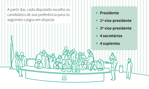 O próximo passo após o registro das candidaturas é a votação. Para ilustrar melhor esse processo, a Agência Câmara fez uma sequência de imagens mostrando de forma simplificada o passo a passo da eleição para a presidência da Câmara: