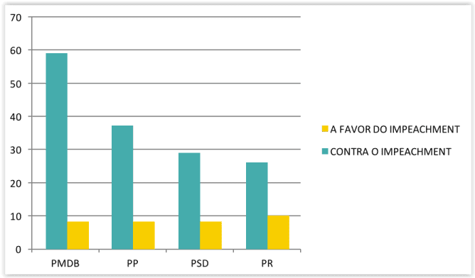 Para se eleger, Dilma – ou o PT – formou coalizão com PMDB, PSD, PP, PR, PROS, PDT, PC do B e PRB. Para fins de comparação, pegaremos a votação do Impeachment na Câmara dos Deputados e veremos quais desses partidos votaram contra a Dilma, ou seja, a favor do impedimento.