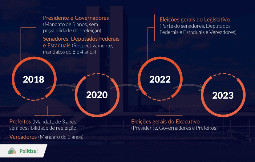 Atualmente, temos eleições a cada dois anos: eleições gerais (presidente, governador, senador, deputado federal e estadual), intercaladas com as eleições municipais (prefeitos e vereadores).