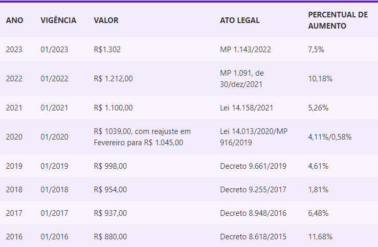 Para calcular o salário mínimo de 2023, foram considerados fatores como a inflação e o Índice Nacional de Preços do Consumidor (INPC). O valor divulgado foi de R$ 1302 passando a valer a partir do dia 1º de janeiro de 2023, tendo percentual de aumento de 7,5% aproximadamente. Veja no quadro abaixo os reajustes executados no período 2017-2023: