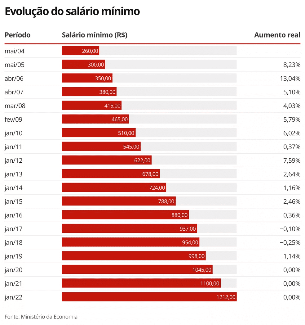 O salário mínimo é reajustado em janeiro de todo ano, na tabela abaixo você consegue conferir o aumento realizado no período entre 2004 até 2022.