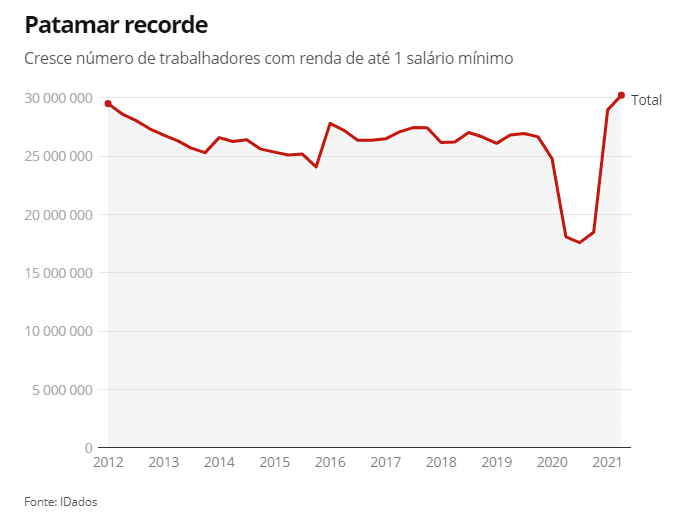 Ainda assim, o salário mínimo significa uma valorização do poder de compra para uma boa parcela da população. Em levantamento realizado pela IDados em 2021, com base nos indicadores da Pesquisa Nacional por Amostra de Domicílio (PNAD), mostra que “[…] no Brasil de alta inflação, o número de brasileiros que sobrevivem com até um salário mínimo é o maior desde 2012″, sendo cerca de 30,2 milhões de pessoas.