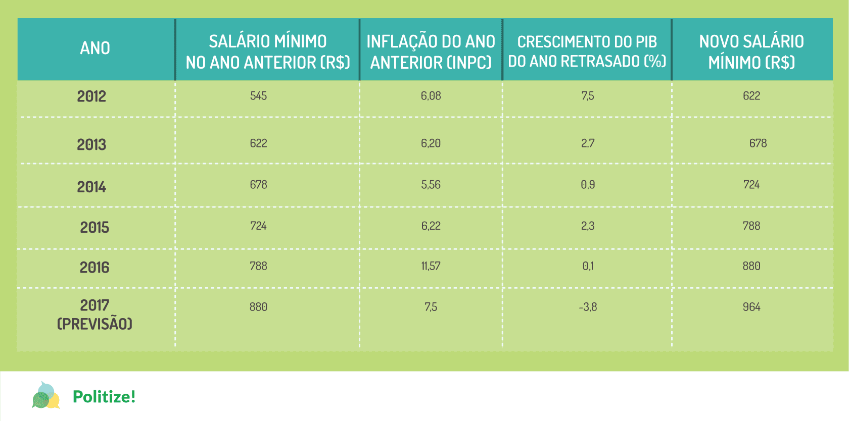 Em 2015, o valor do mínimo era de R$ 788. Ao final do ano, o governo teve de colocar na conta os 11,57% de inflação medidos pelo Índice Nacional de Preços ao Consumidor (INPC) em 2015 mais o 0,1% de crescimento do PIB em 2014. Com isso, houve um reajuste de 11,67% no valor do salário mínimo, que passou a valer R$ 880. Em 2017, o salário mínimo valia R$ 937,00, após aumento de 6,74% em relação a 2016.