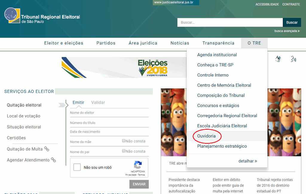 Caso seja de seu interesse o procedimento on-line, basta ir ao site do TRE de seu estado -TRE + UF, como TRE-SC, por exemplo – e procurar pela parte de Ouvidoria, que está geralmente localizada na aba “TRE”, na parte superior da página.
